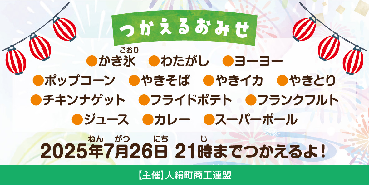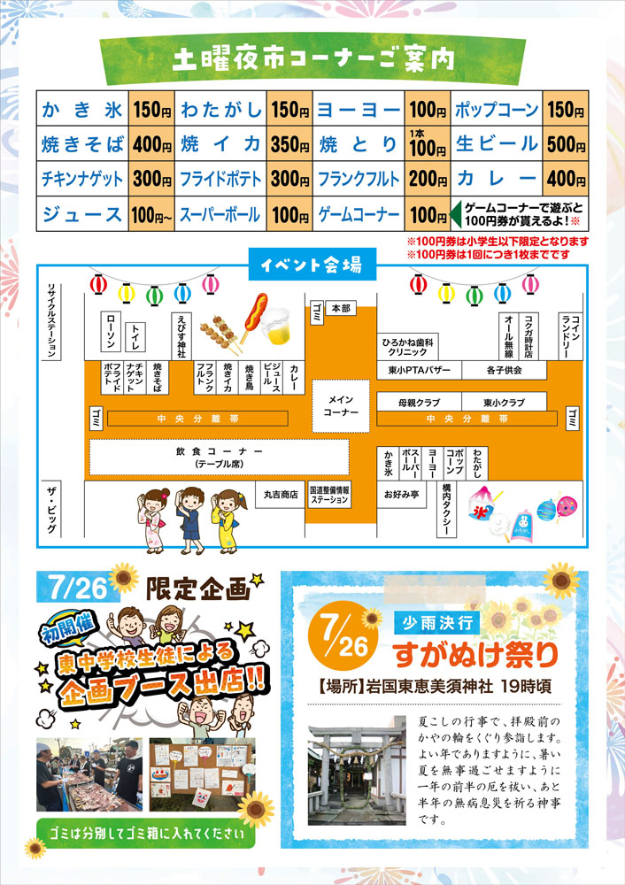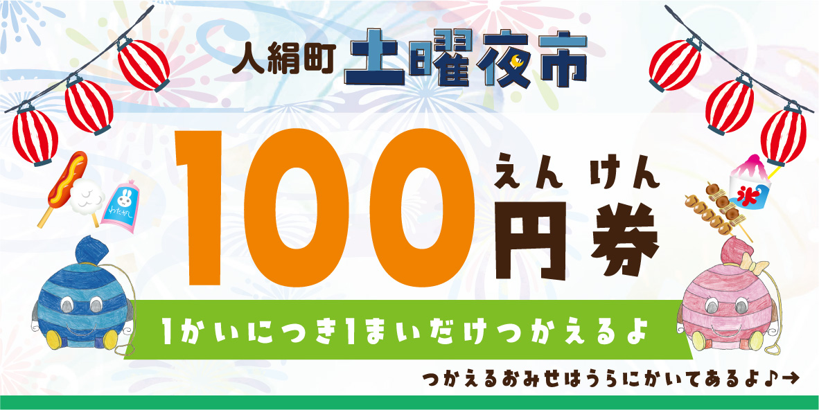 7月の第2〜第4土曜日に開催された人絹町の土曜夜市のチラシと100円券のデザインを作成しました。